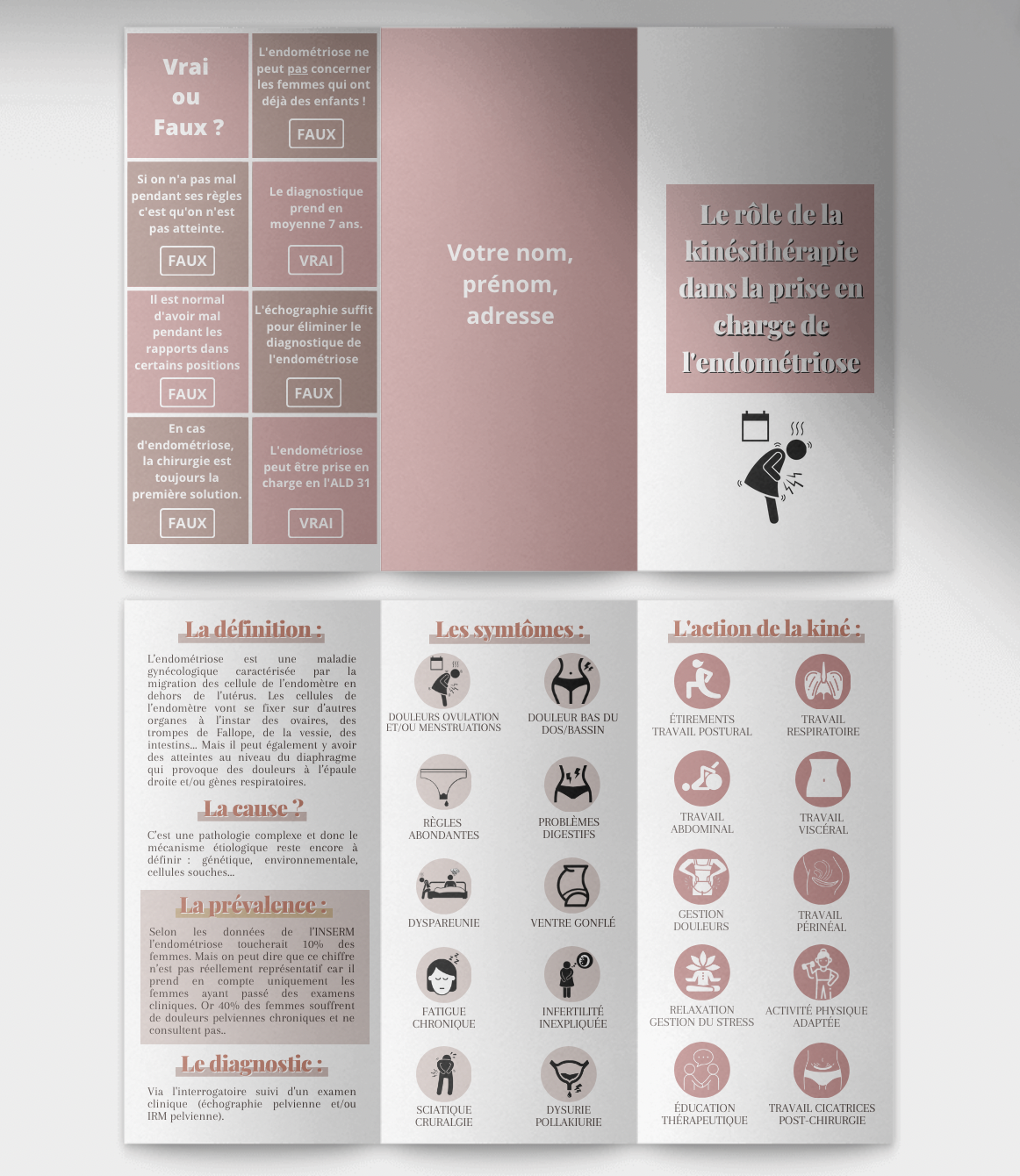 Flyer pour informer les professionnels de santé et les patients sur le rôle de la kinésithérapie dans l'endométriose.